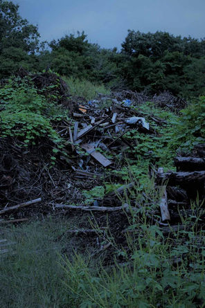 最後に森と人間が作り出す環境の姿の一端として写真作品を展示する。 1974年、Kの家は建築され、その後46年間に渡り森は開発され変容し続けた。今から30年ほど前までKの家の坂を下った場所は、広々とした水田だった。山荘にいても農夫たちの楽しげな歌声が聞こえてきたと季子さんは語る。しかし、高度成長期、軽井沢は空前のテニスブームとなり、水田も当たり前のようにアスファルトのテニスコートへと様変わりした。それから数十年が経った現在、ブームはすっかりなりを潜め、自然の苔が誰も使用しなくなったテニスコートを覆っている。またKの家から歩いて5分程度の場所に建築廃材が集積された場所がある。そこには伐採された巨大な枯れ木の山がそびえ立つ。しかし今回、この場所を訪れた時、そのような場所にも再生した一群の露草の澄んだ青が光っていた。